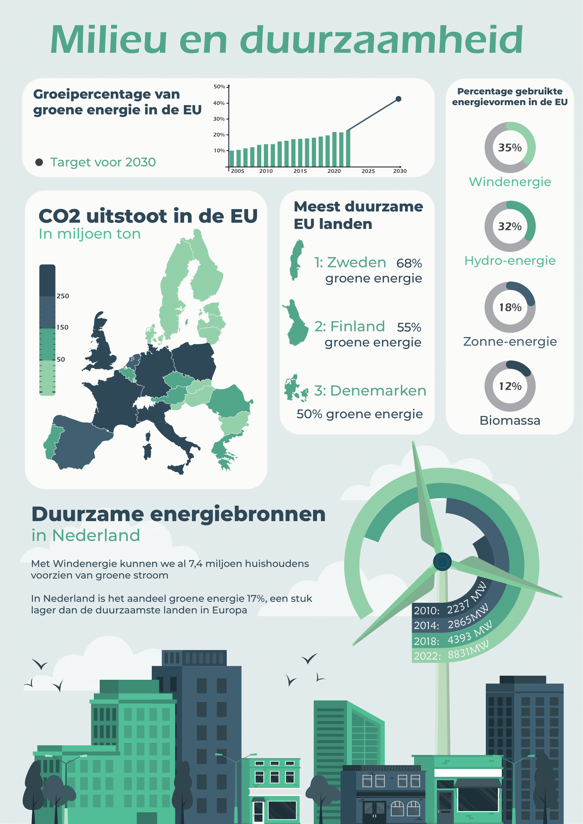 This infographic presents key insights on sustainability and green energy in the EU through a clean, well-structured design. Using maps, charts, and icons, it highlights CO2 emissions, renewable energy sources, and the most sustainable countries. With a calm visual style and balanced color palette, the infographic makes complex data easy to understand. The goal is to both inform and inspire more conscious and sustainable choices.